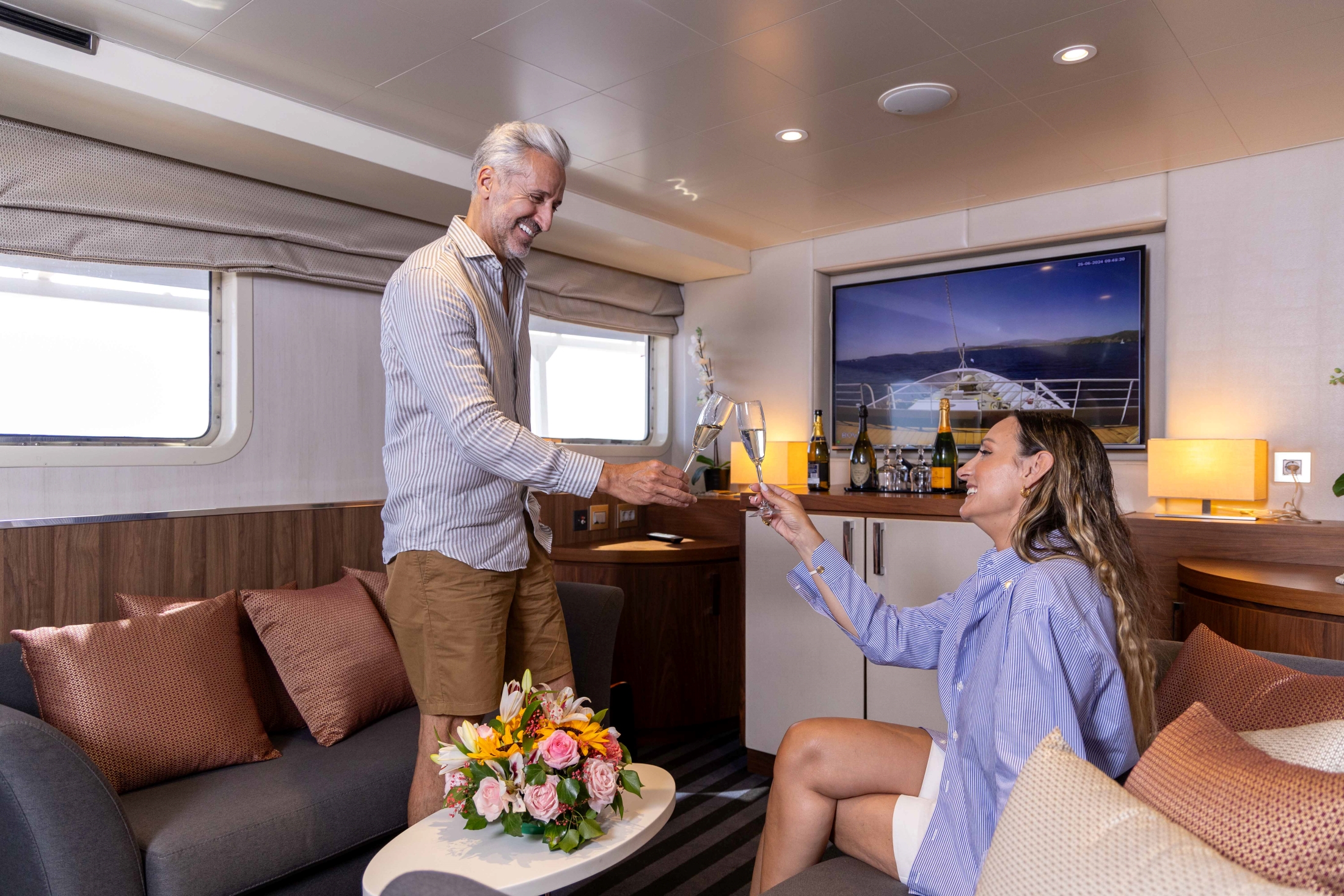 Elevating your experience, Cosmos introduces the VIP Executive Cabin Suite – a first of its kind on a cruise yacht. This private sanctuary offers unmatched luxury, with all the amenities